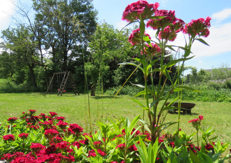 Unser großer Garten bietet ein Trampolin, ein Feder- und Volleyballnetz, sowie ein Fußballtor und eine Schaukel – Langeweile ist bei uns ein Fremdwort!